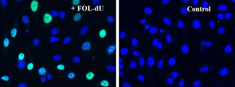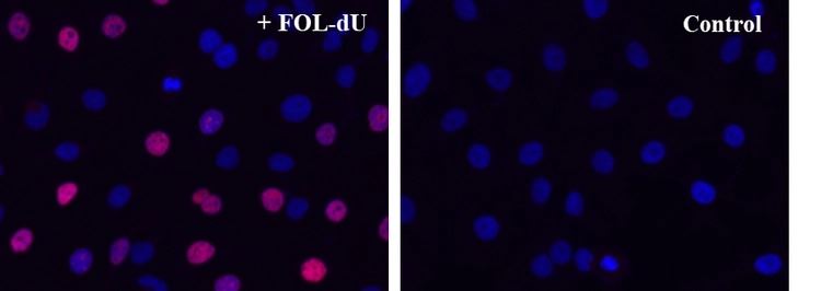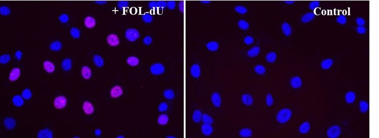 Bucculite™ FdU Cu Free Cell Proliferation Fluorescence Imaging Kit 使用胸腺嘧啶核苷的類似物 FOL-FdU (Fluorodeoxyuridine) 取代 BrdU 來標定 DNA。因 FOL-FdU 在 DNA 合成過程中會被併入細胞的 DNA 中,細胞固定後,接著使用螢光結合的 MTA-iFluor® 來標定併入的 FOL-FdU,FOL 會與 MTA 產生交聯反應,且無須任何的催化劑。最後可於相對應的螢光濾片組中,觀察細胞中 iFluor® 螢光標定的 DNA。