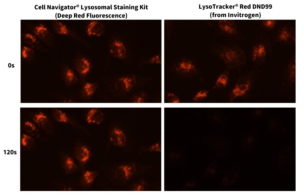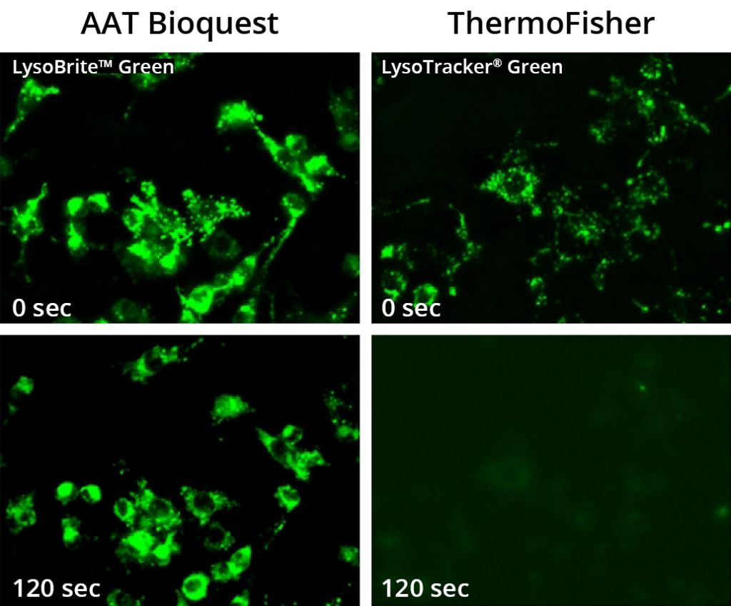 LysoBrite™ 染劑的性能顯著優於同等的 LysoTracker™ (Invitrogen)。 LysoBrite™ 染劑可以在活細胞內停留一週以上,且細胞毒性極小,而 LysoTracker 則只能使用幾個小時。 此外,LysoBrite™ 在細胞分裂後可以存活好幾代,且光穩定性比 LysoTracker 高得多。LysoBrite™ 可用於多種研究,包括細胞貼附、趨化性、多重抗藥性、細胞存活率、細胞凋亡和細胞毒性。