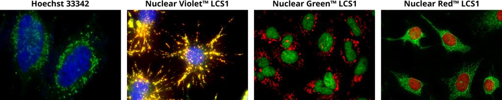 AAT Bioquest 提供多種細胞通透性之細胞核染劑包括 DAPI、Hoechst 染劑 (Hoechst 33342, Hoechst 33258, Hoechst 34580) 及獨有的染劑,如 Nuclear Violet™ LCS1、Nuclear Green™ LCS1、Nuclear Orange™ LCS1 和 Nuclear Red™ LCS1/LCS2 等多種顏色的染劑,可用於標記活細胞、死細胞和固定後的細胞。