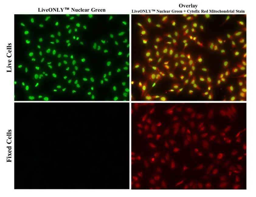 (除 LiveONLY™ Nuclear Green 只標記活細胞,其他染劑皆可染到活細胞及固定後的細胞)