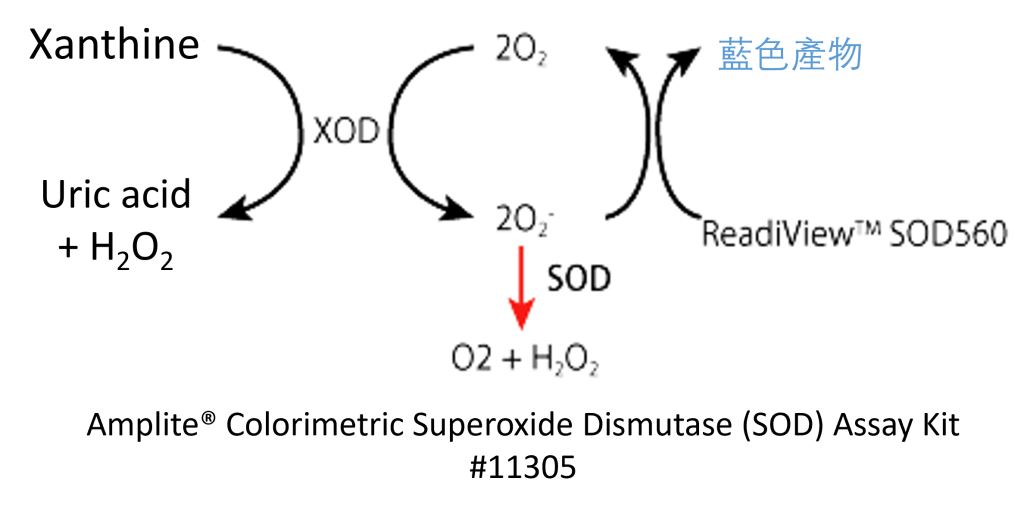於檢測套組中,黃嘌呤 (xanthine) 在黃嘌呤氧化酶 (xanthine oxidase, XO) 的作用下轉化為超氧自由基離子 (superoxide radical ion)、尿酸及過氧化氫。超氧自由基會與 ReadiView™ SOD560 反應,生成一種在 560 nm 附近有吸收值的產物。超氧化物歧化酶 (SOD) 會抑制 ReadiView™ SOD560 與超氧自由基的反應,進而降低 560 nm 處的吸光度,此數值與 SOD 的活性成正比。