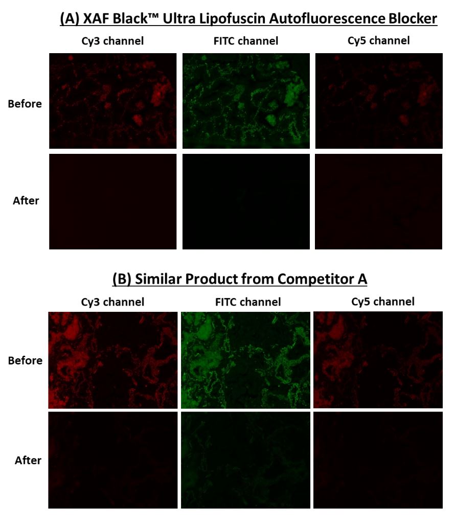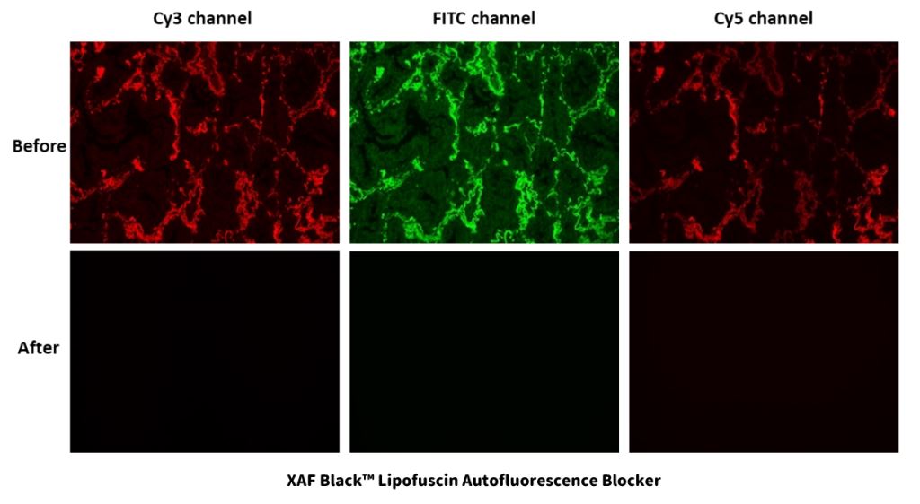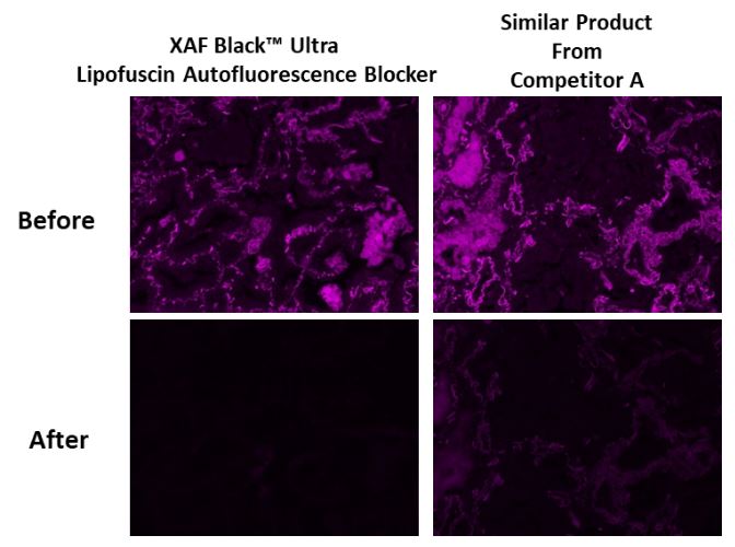 XAF Black™ Lipofuscin Autofluorescence Blocker 為一款專為降低脂褐素的自體螢光而配製的試劑,可有效阻斷脂褐素的自體螢光,還可以降低其他背景螢光以及來自其他來源的自體螢光,如膠原蛋白、彈性蛋白和紅血球。而 XAF Black™ Ultra Lipofuscin Autofluorescence Blocker 則是 XAF Black™ Lipofuscin Autofluorescence Blocker 最新升級版,它顯著的增強了螢光猝滅的能力,並大幅提高了其水溶性。