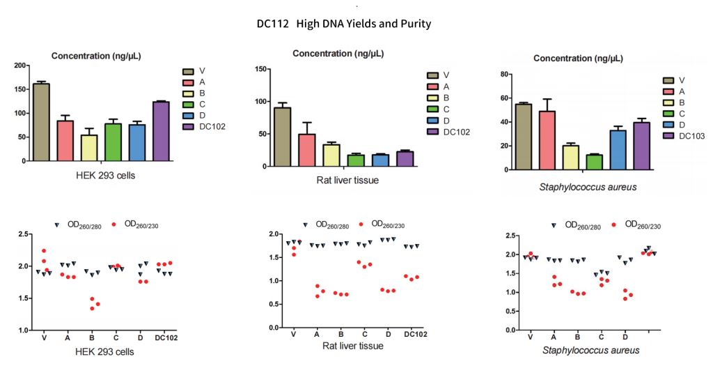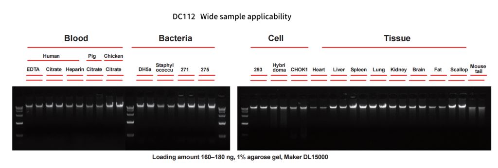 型號 DC112:gDNA「萃取總量、完整度、純度」表現更好,更適用於少量動物組織和細菌樣品